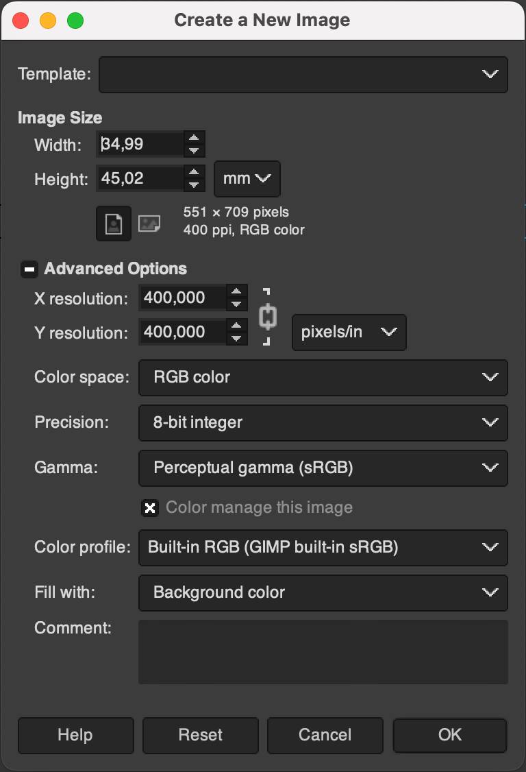 Создаем новый шаблон 35 x 45 мм, с плотностью 400 x 400. пикселей на дюйм.