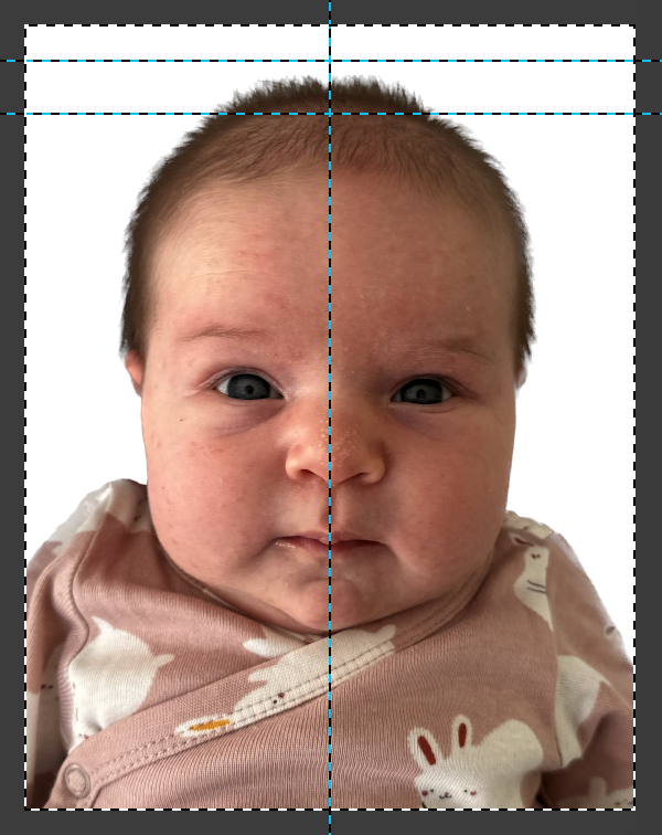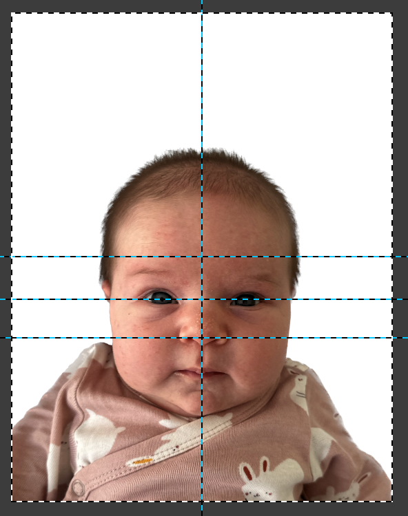 Позиционируем и масштабируем ребенка. Верхний край головы должен быть на расстоянии от 2 до 5 мм от верхнего края кадра. Овал головы по высоте от 30 до 34 мм.